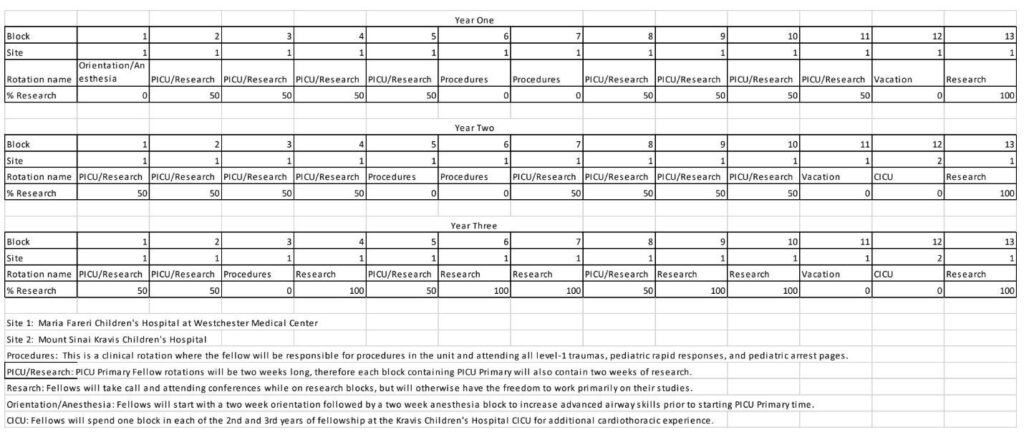 CICU blocks are specific to years two and three where the fellow will run the CVICU service at Mount Sinai Kravis Children’s Hospital.