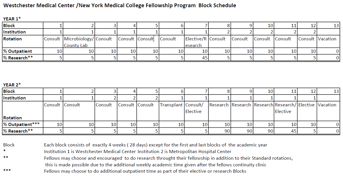 Westchester Medical Center, the main training site for the program, is a 415-bed quaternary referral center and flagship hospital for a large healthcare system. It is also the primary teaching hospital for NYMC. Westchester Medical Center is known for having one of the highest case mix indices in the United States, meaning that its patients are among the most clinically complex of any hospital in the country providing the best opportunities to learn and care for a population spanning all medical and surgical subspecialties, including solid organ and bone marrow transplantation, HIV, tick-borne diseases, critical care medicine including ECMO and LVAD, burn patients, neuro and level 1 trauma ICU patients. Our program also has an antimicrobial stewardship team that provides guidance and clinical pathways for best antimicrobial use.