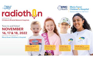 VALHALLA, N.Y. (November 11, 2022) – Now hear this! The annual 100.7 WHUD Radiothon for the Kids (Radiothon) is returning to Maria Fareri Children’s Hospital November 16-18, after two years of in-studio broadcasts. 100.7 WHUD personalities will speak live from the lobby of Maria Fareri Children’s Hospital with children and their families who will share their stories of triumph over significant medical challenges. Maria Fareri Children’s Hospital nurses and physicians will also speak live in what is sure to be an energetic and uplifting environment.