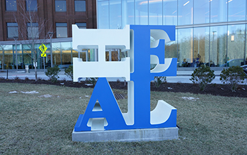 The sculpture, fabricated by B.K. Signs, Inc., spells heal with the “H” lying on its side. According to Singer, with the “H” askew the sculpture signifies that something needs to be corrected or healed.